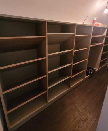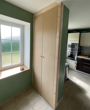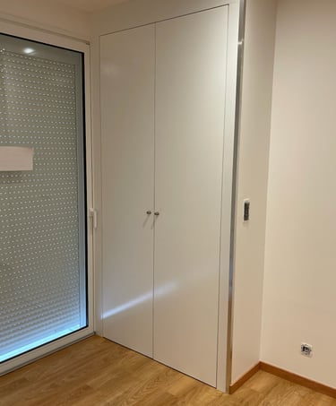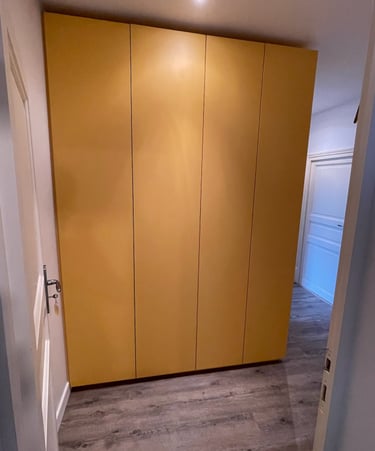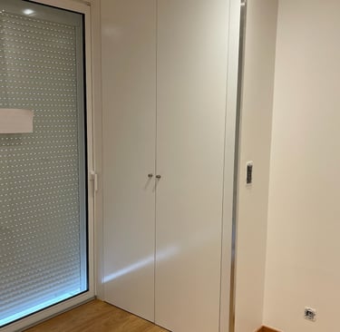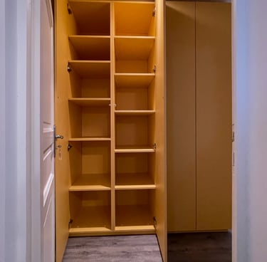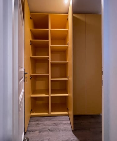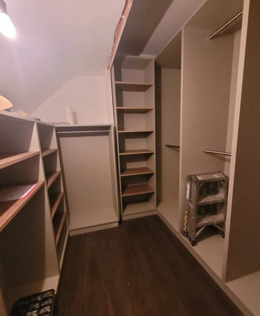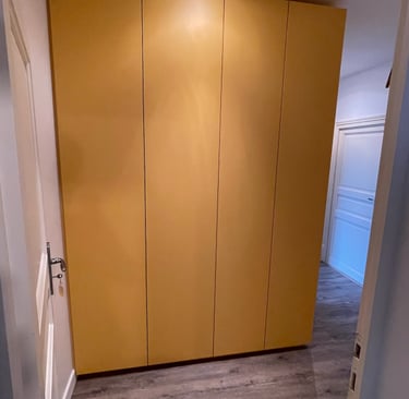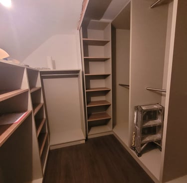 Optimisation de l'espace avec des penderies, étagères ajustables, tiroirs personnalisés et portes battantes, coulissantes ou pliantes. Installation professionnelle, soignée et précise, pour un résultat fonctionnel et esthétique.